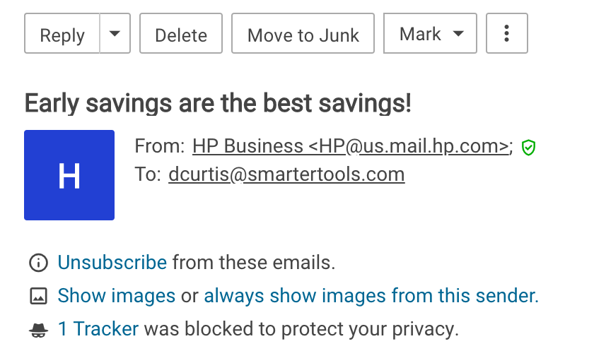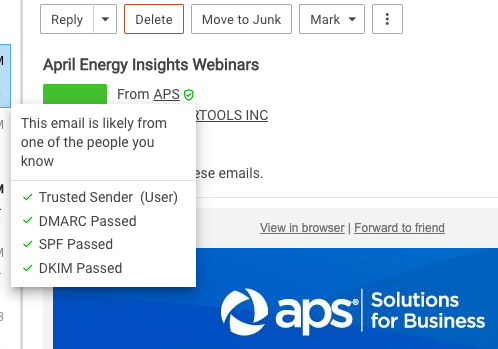 Now, a red mark doesn’t necessarily mean the sender ISN’T who they say they are. However, it’s always best to know, and then check why the sender may be suspect. It could be that their DMARC check failed, which can be an indication that it’s simply not set up, especially if their SPF and DKIM records check out.